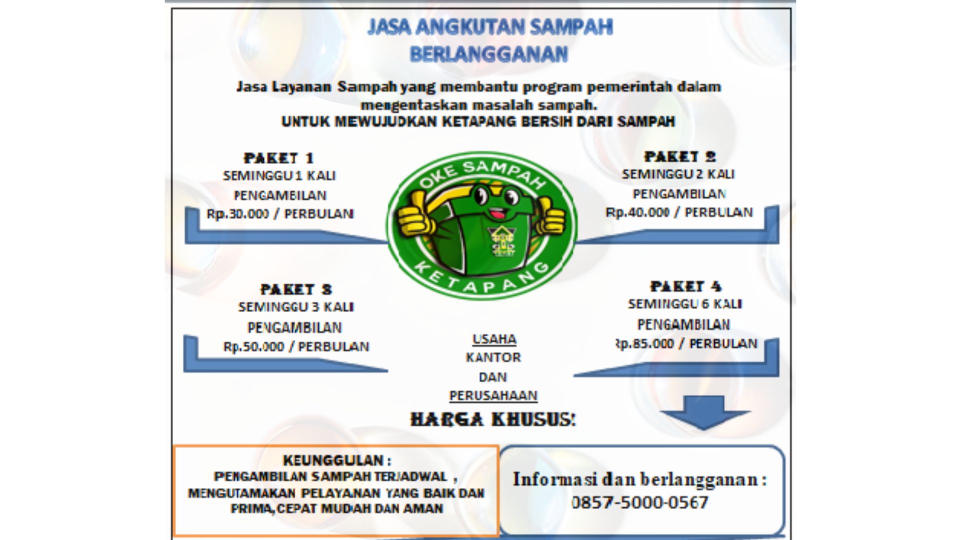 Jasa Layanan Pengangkutan Sampah yang membantu program pemerintah dalam mengentaskan masalah sampah . UNTUKMEWUJUDKAN KETAPANG BERSIH DARI SAMPAH